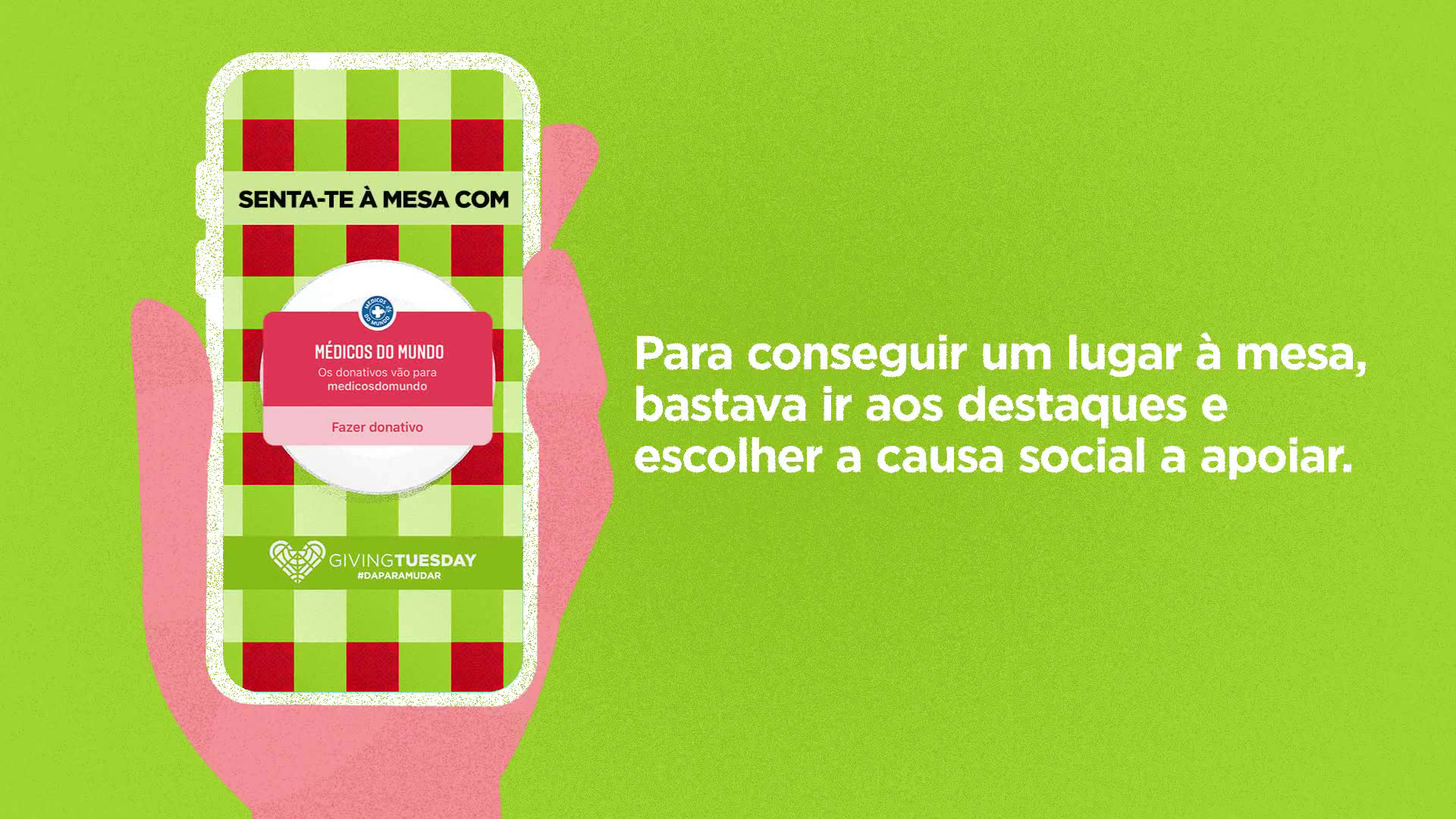 Para anunciar a primeira edição do movimento em Portugal (3 de dezembro), criámos A maior mesa solidária do mundo: a primeira mesa digital de doações, que nos convida a sentar com causas sociais para ajudar quem mais precisa. Usámos a wall de Instagram do @givingtuesdaypt e criámos centenas de lugares com pratos vazios (posts com pratos vazios). Para conseguir um lugar à mesa, bastava ir aos destaques do perfil e escolher a causa social a apoiar. Por cada doação feita através do widget de doação, trocávamos um prato vazio da mesa por um prato cheio.